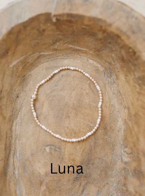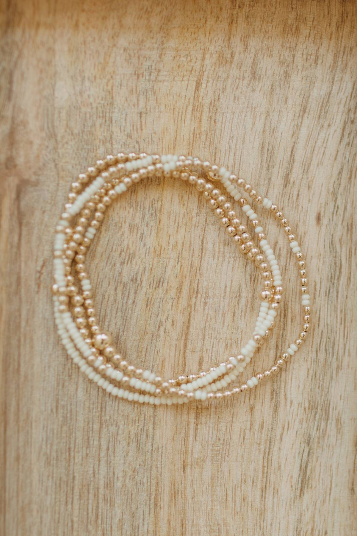 This cream czech seed bead bracelet set is a perfect neutral addition to any stack. Made with dainty 3mm beads on a comfy stretch cord, these bracelets are lightweight, stylish, and easy to wear every day. Three styles available.
