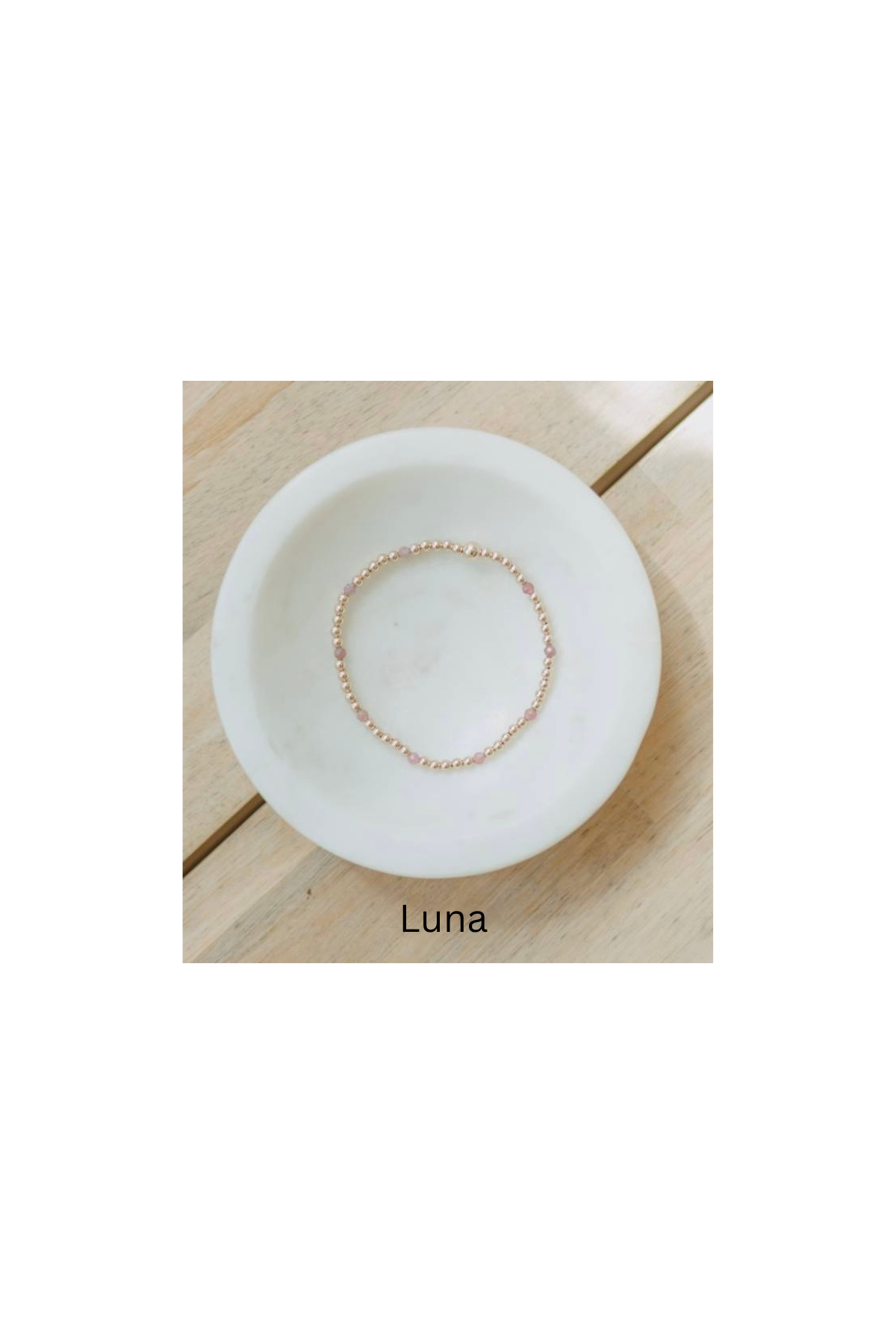 A delicate blend of elegance and meaning, featuring genuine pink tourmaline gemstones the birthstone of October with accents of 14k gold filled beads. Three styles are available.